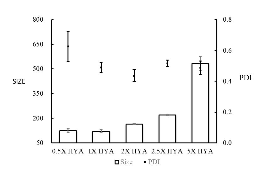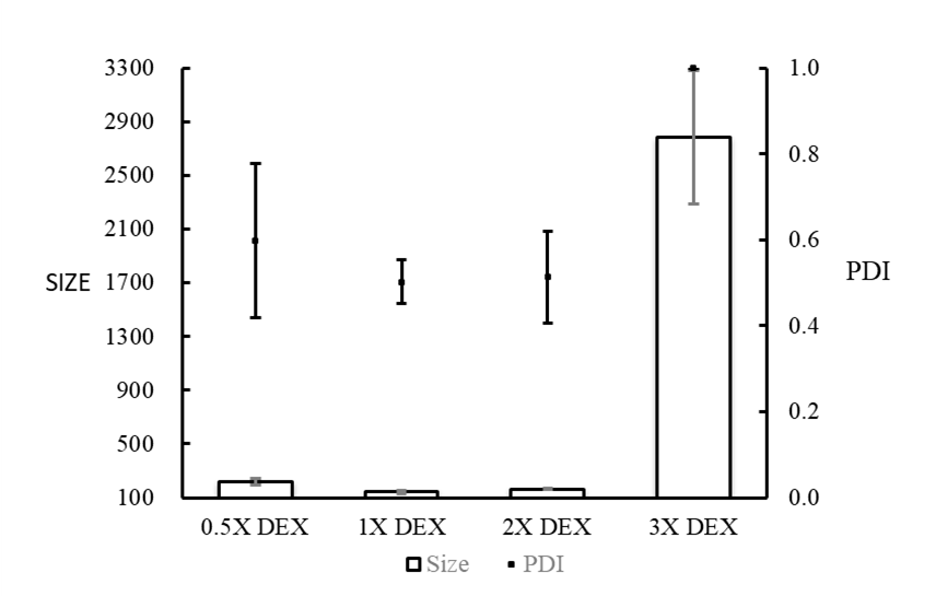 该实验条件下,原浓度即1.379 mg/mL 的HYA水溶液可得粒径最小的HYA-DEX纳米颗粒。虽然原浓度稀释2倍的HYA水溶液(0.5xHYA)粒径与未稀释时相差较小,但PDI显著增高,所以HYA水溶液浓度为1.379 mg/mL时合成纳米颗粒效果最好。