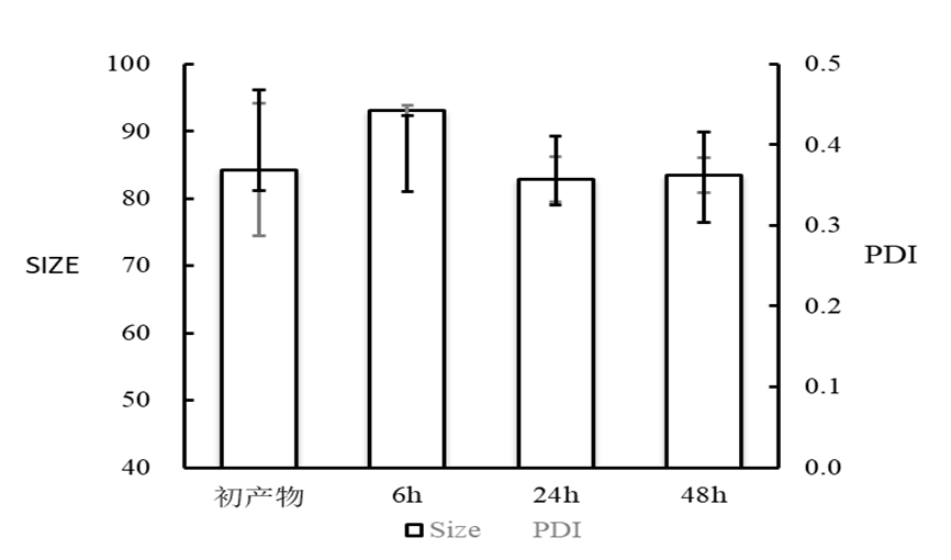 该实验条件下,合成的HYA-DEX纳米颗粒可以在4℃下短时间保存48h,粒径及PDI无显著变化。