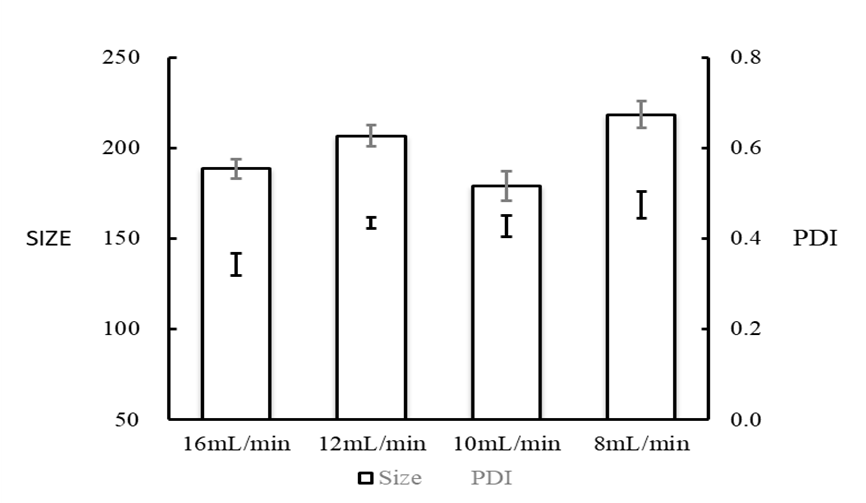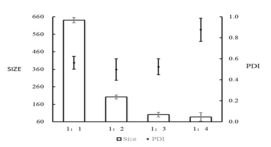 该实验条件下,流速比1:4时粒径最小,但PDI显著增高,而流速比1:3时粒径与流速比1:4时相差较小,PDI较低,所以流速比1:3时时合成纳米颗粒效最好。