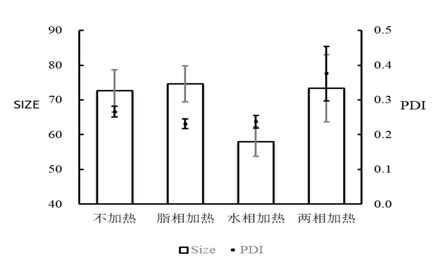 微流控参数:总流速:10 mL/min;流速比(脂相:水相=1:3);前废液0.3mL;对水相不同温度加热;加热3min;使用PBS将产物稀释至1 mg/mL检测。