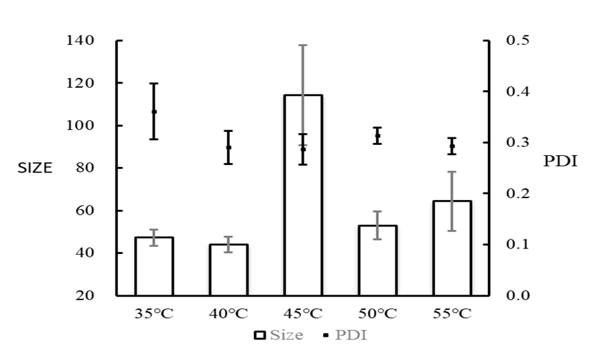 该实验条件下,产物合成前对水相40℃预加热,合成的HYA-DEX纳米颗粒粒径最小。