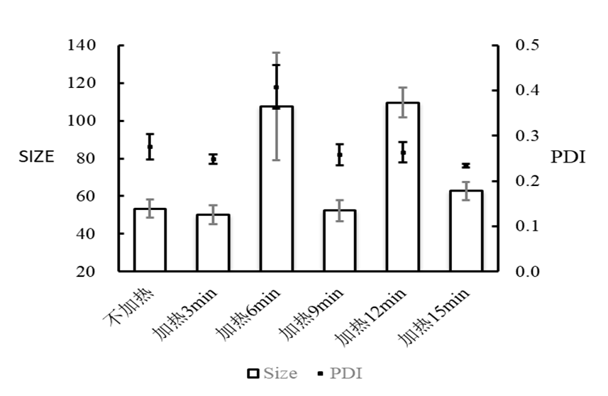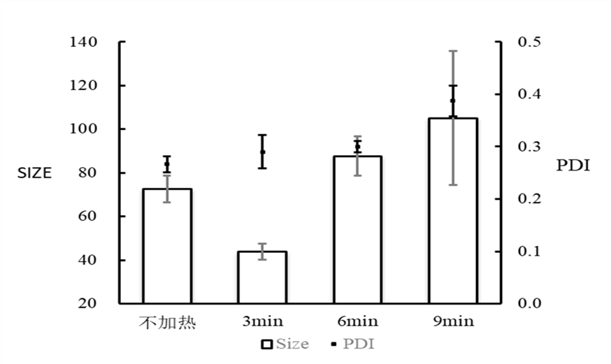微流控参数:总流速:10 mL/min;流速比(脂相:水相=1:3);前废液0.3mL;合成前对水相40℃预热3min;产物40℃加热;加热不同时长;使用PBS将产物稀释至1 mg/mL检测。