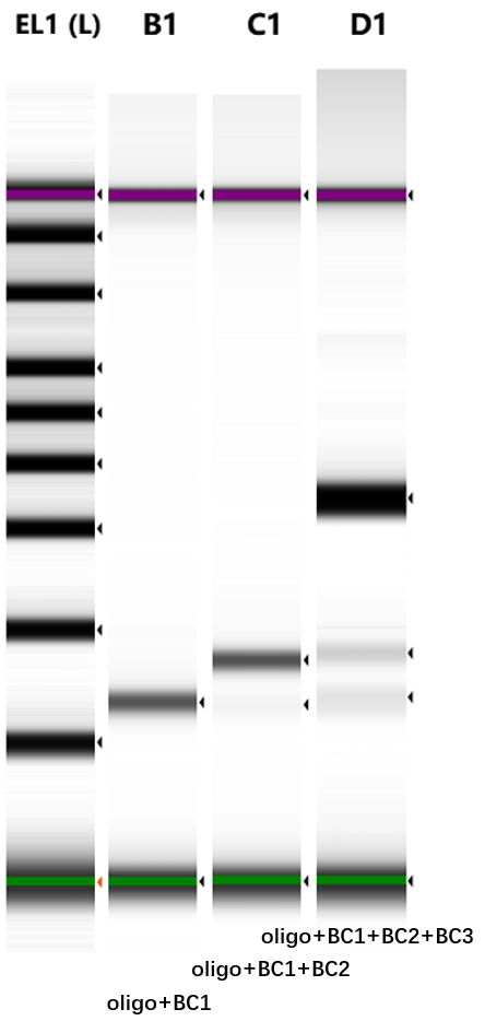 | 连上barcode后的FAM探针质检 | 多段barcode连接后的电泳检测 |
